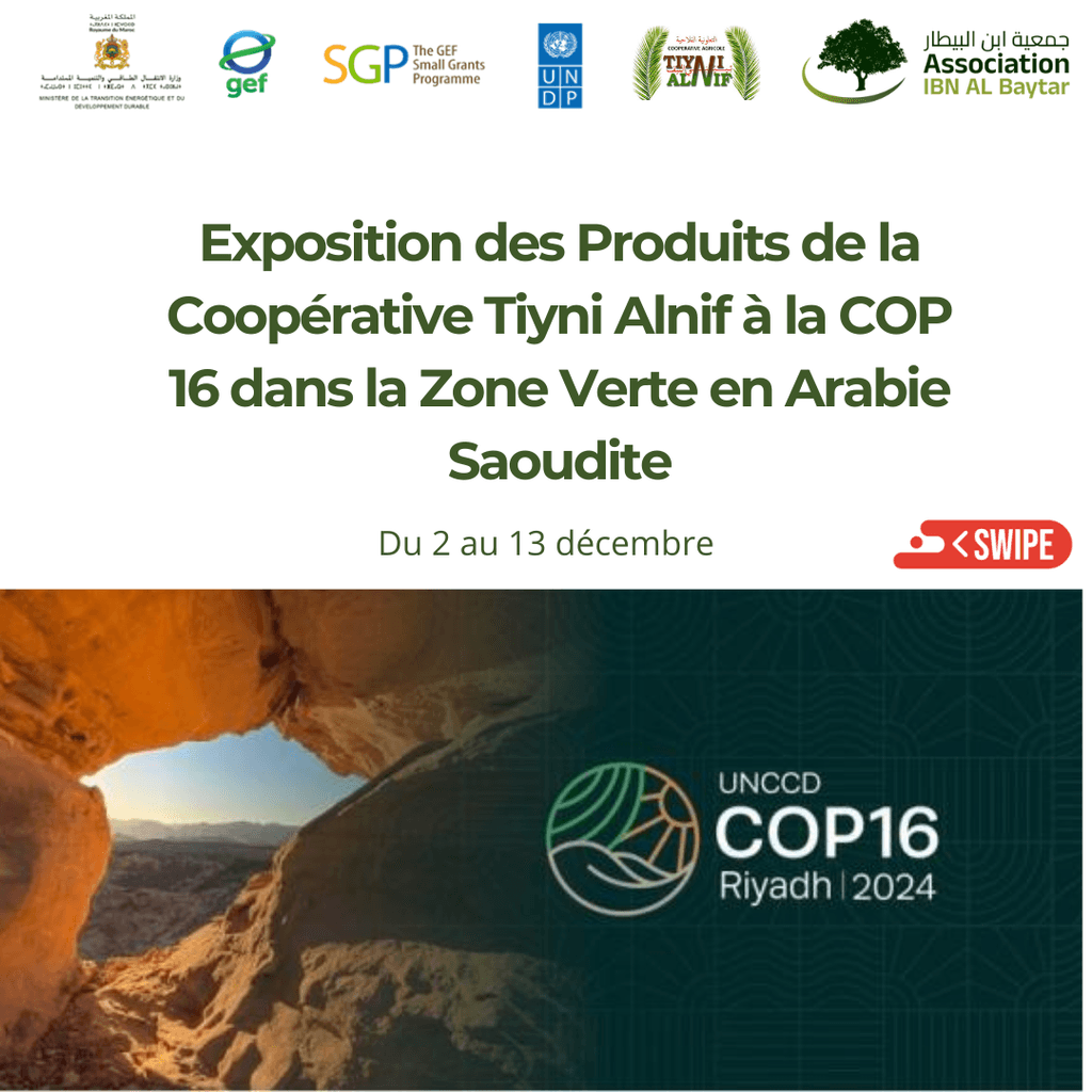 🌟 Nous sommes heureux de partager une excellente nouvelle ! Les produits de la coopérative Tiyni Alnif, fondée par l'Association Ibn Al Baytar (AIB), ont été présentés lors de l'exposition de la COP 16 et dans la zone verte en Arabie Saoudite.